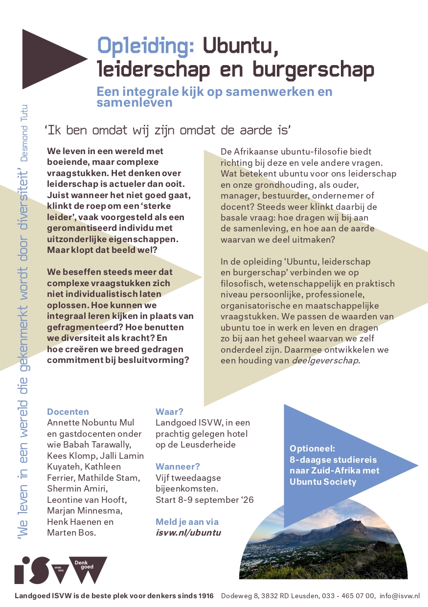 In de Opleiding Ubuntu, Leiderschap en Wereldburgerschap zullen we op filosofisch, wetenschappelijk en praktisch niveau samen zoeken, verbanden leggen en de synergie ervaren tussen persoonlijk professionele, organisatorische en maatschappelijke vraagstukken. We zullen de waarden van Ubuntu toepassen in werk en leven en daarmee gezamenlijk bijdragen aan het geheel waar we zelf onderdeel van zijn. Met andere woorden: we ontwikkelen een houding van deelgeverschap.